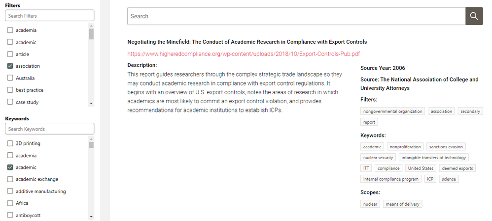 The Hub fills a critical resource gap by helping governments and other stakeholders locate resources easily and efficiently and facilitate its application to the implementation of effective nonproliferation and strategic trade activities, from policymaking, to research, to industry export control compliance, and more. The STRI team carefully reviews and selects Hub resources in order to help the broad spectrum of nonproliferation stakeholders be connected to information and resources that can help them make an impact.